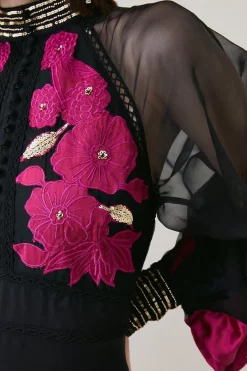 Demonstrate a penchant for fine details in this elegant applique organdie dress. Enlivened with vibrant floral applique motifs, this opulent organdie design is perfectly suited to grand occasions. Balloon sleeves add dimension to the dress, while intricate gold sequins amp up the glamour.