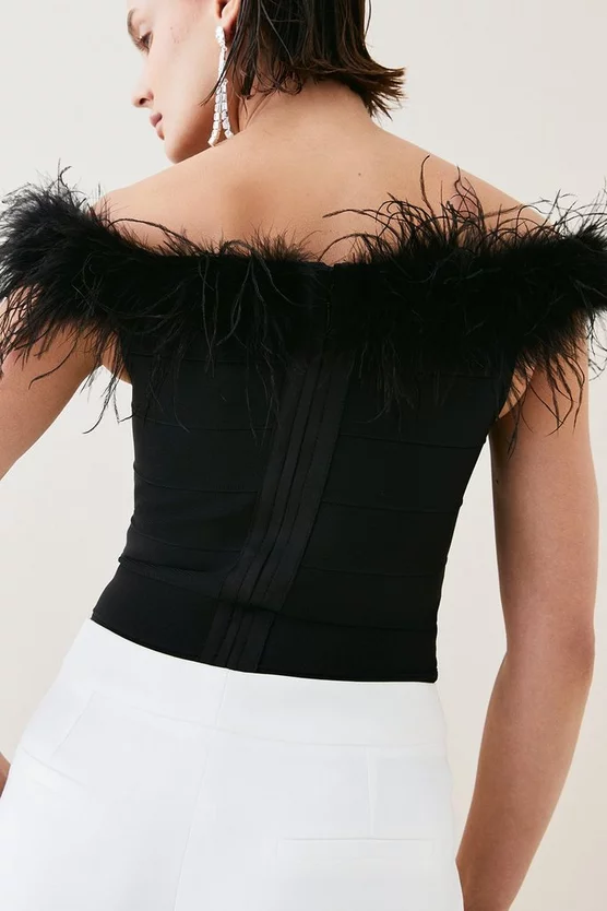 Playful proportions define this after-dark piece. With a tactile feather trim and contouring bandage composition, it defines the silhouette with second-skin aplomb.