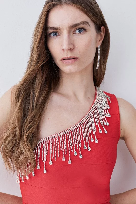 Flash Sale ⭐ Karen Millen Bandage Diamante Trim One Shoulder High Low Midi πŸ‘— Dress – orange πŸ˜‰