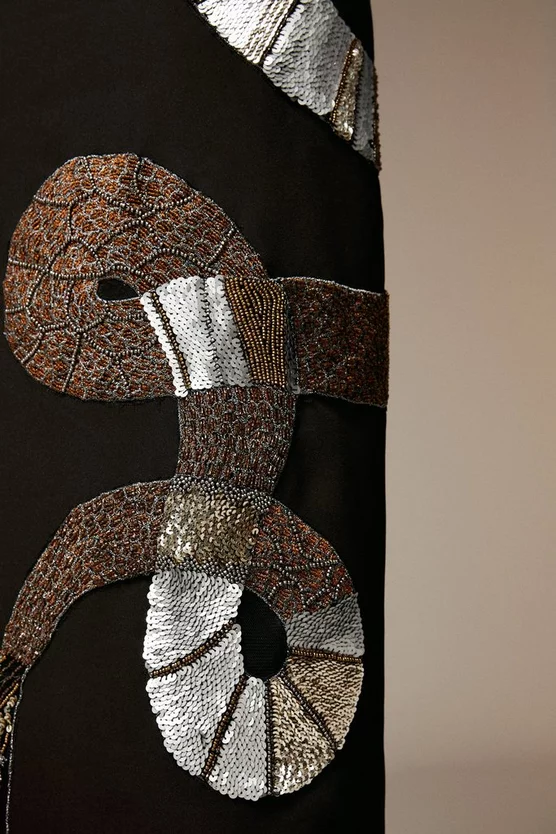 Divinely decorated with a dragon motif crafted from hand-embroidered sequin and bead embellishments, this midi dress strikes the perfect balance between surreal and sultry. This eclectic piece takes inspiration from mythology and exudes artisanal allure to the highest degree. Style with sleek black heels and minimal accessories for a truly captivating after-dark look.