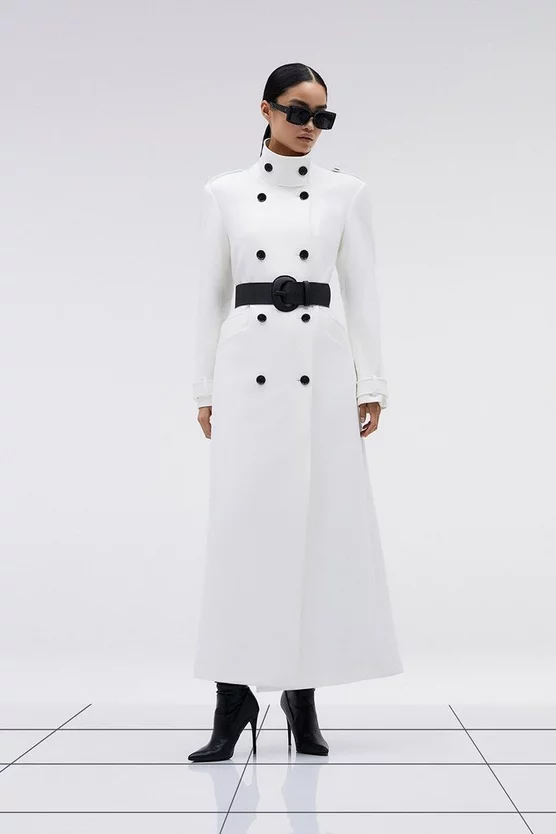 Exuding an instantly luxe aesthetic, this trench coat creates a powerful style statement. Crafted with bonded double compact fabric for a structured fit, this coat offers tailored sophistication. Sleek black buttons contrast beautifully with the ivory hue, while a black faux leather belt, strong shoulders and a mock neck add further impact.