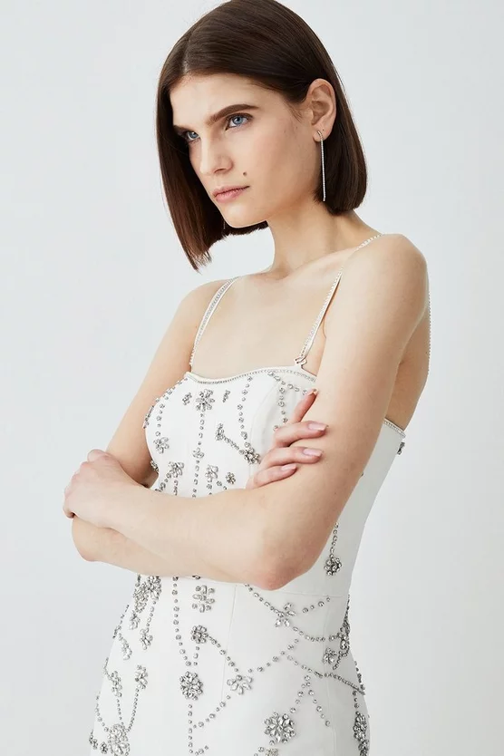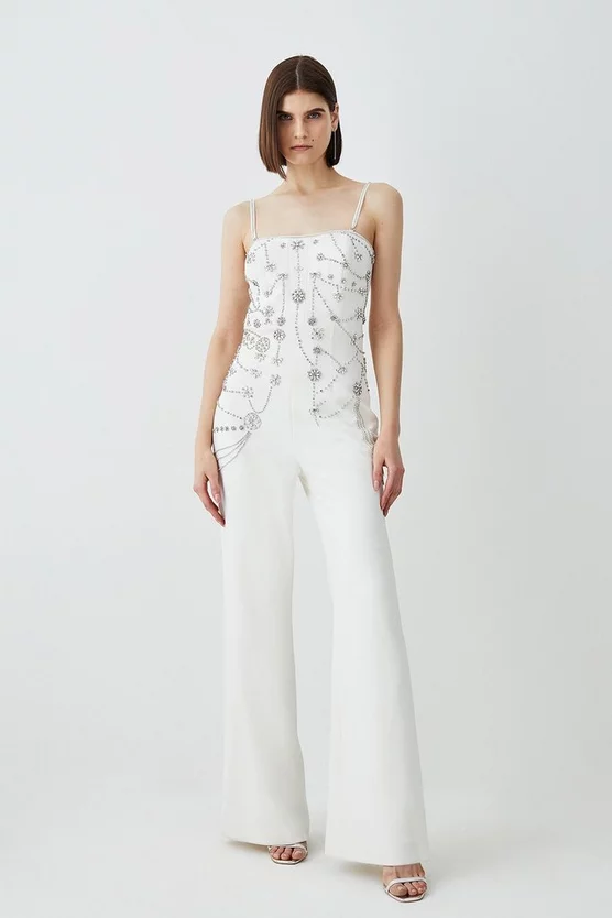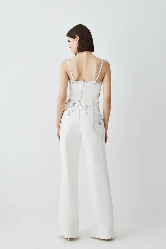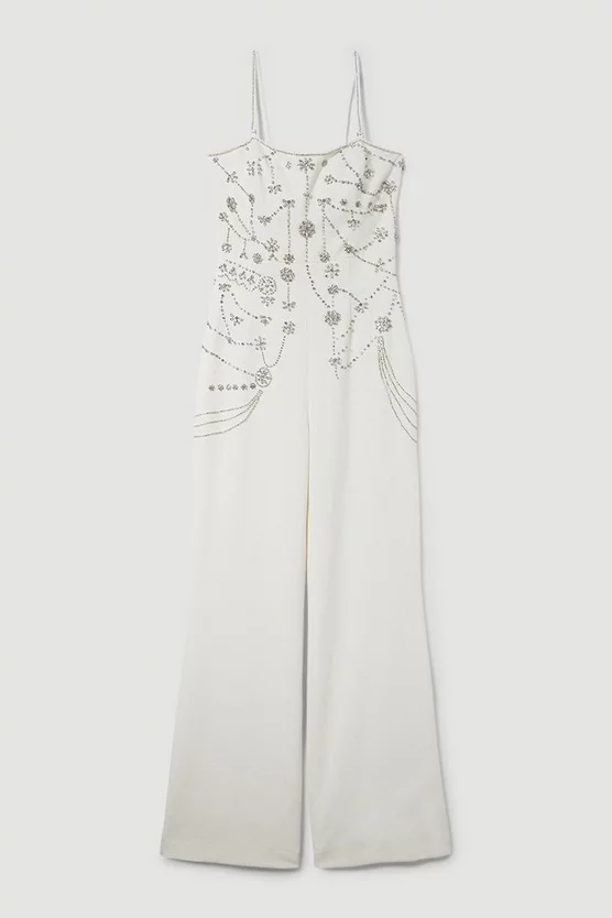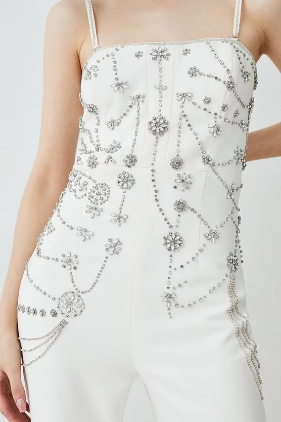 The epitome of opulence, this jumpsuit promises to make an unforgettable impression at your next event. Adorned with intricate claw crystals for a glamorous touch, this design is best styled with matching accessories and silver heels.