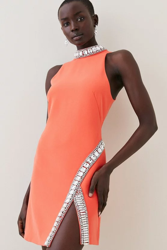 Indulge in a spot of sartorial hedonism this summer, starting with our show-stopping colour-pop mini dress. Lined with chunky crystal trims for an alluring Art Deco feel, it looks spectacular glinting beneath the moonlight at special soirees and shows off polished legs beautifully thanks to a seductive thigh split. The clean, sleeveless cut comes further accentuated by a back cut-out to hint at another sliver of sun-kissed skin.