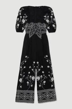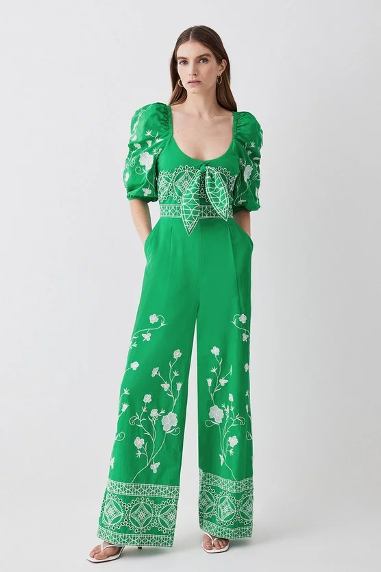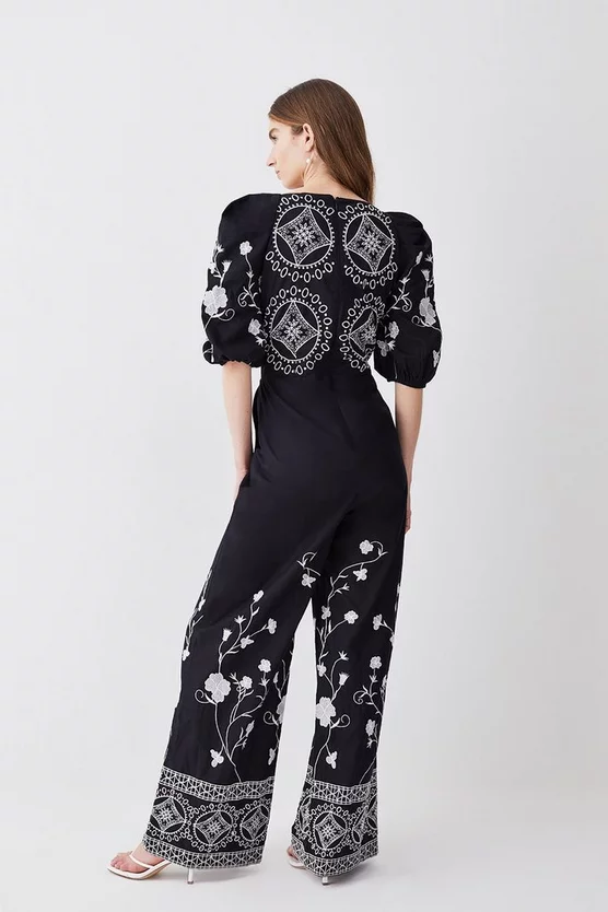 Embrace summer romance in this exquisite jumpsuit. Intricate embroidery creates a sense of bohemian allure, further emphasised by puff sleeves and wide leg trousers.