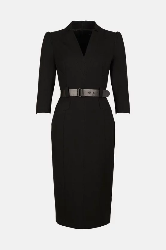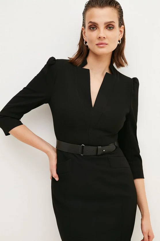 Meet the dress you’ll rely on forever. A timeless addition to any desk-to-dinner wardrobe, it features a high notched collar, V-neck front, puffed shoulders, three-quarter length sleeves, belted waist, back vent and comes in midi length.