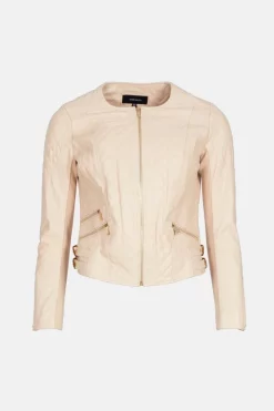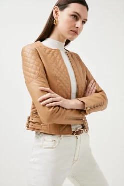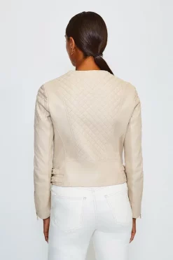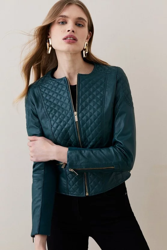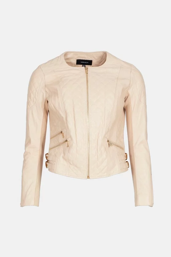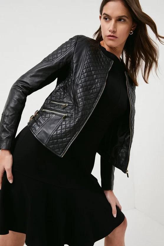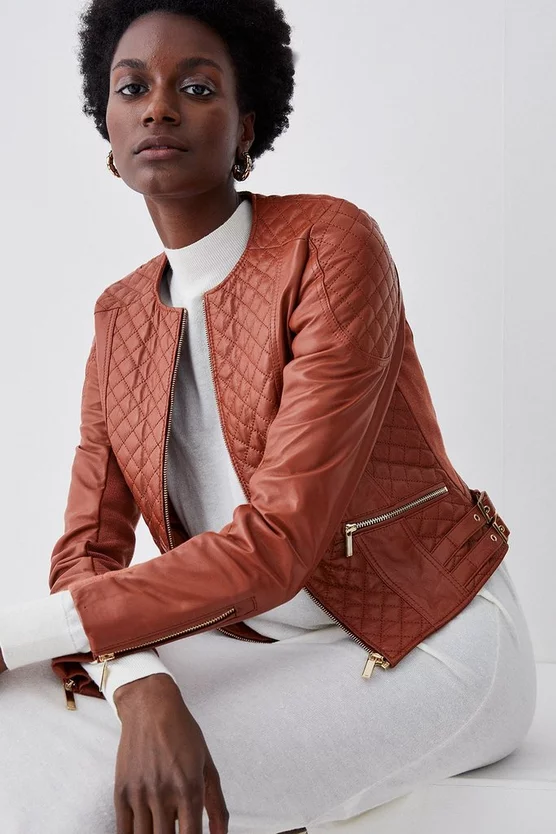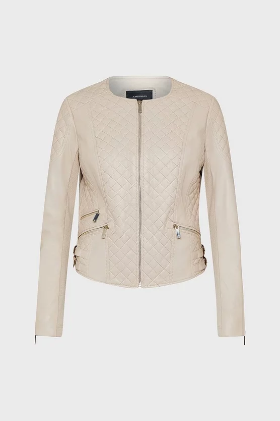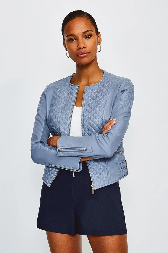 This quilted leather jacket is a total all-rounder; from running errands to a night out. The style is panelled for a tailored fit, so it looks good worn open or closed, while the round collarless neckline is an unfussy style. Quilted panelling creates interesting texture, and the look is finished with stretch rib-knit fabric at the side body and inside arms for comfort. Created in soft lambskin leather and satin lining.