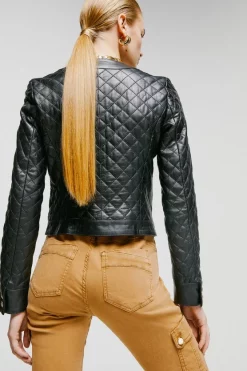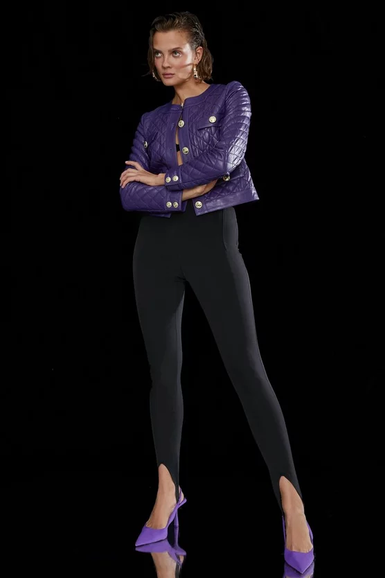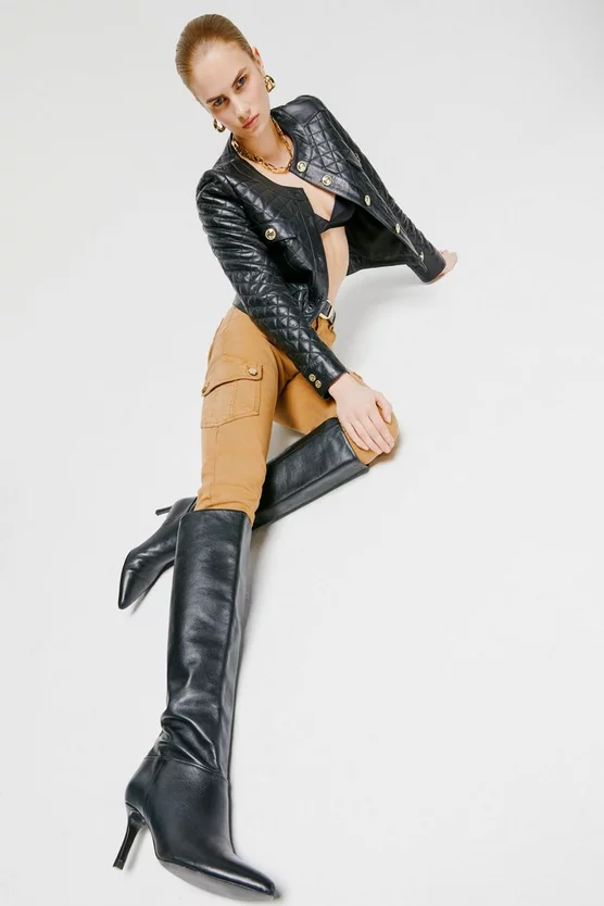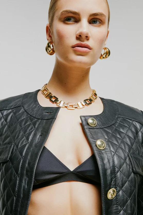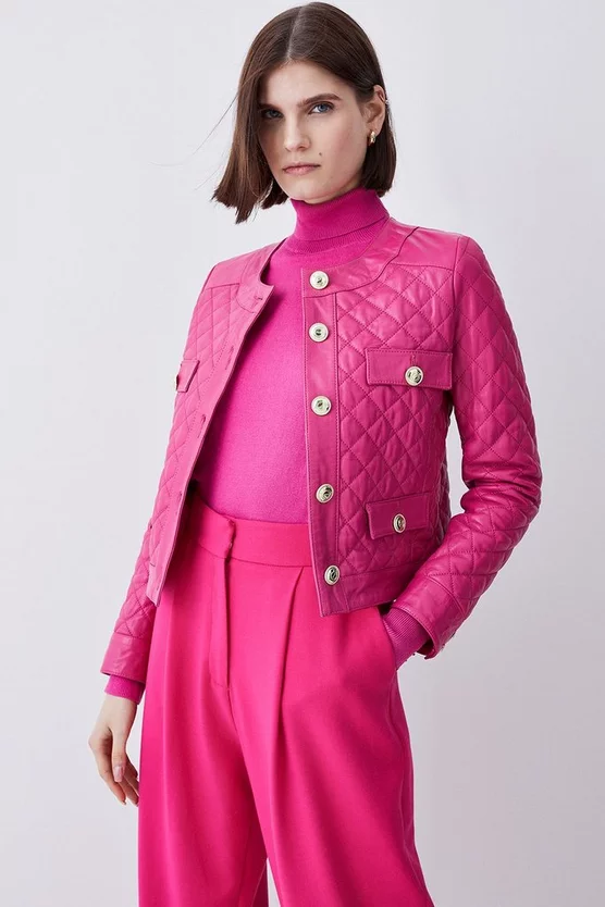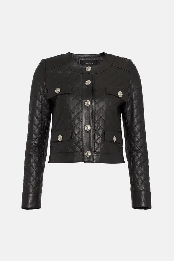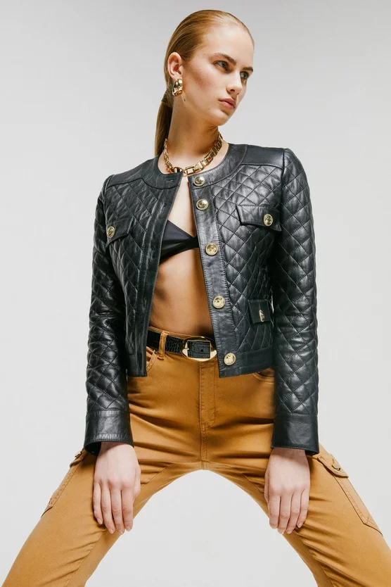 The classic trophy jacket for a modern age. Reworked in our signature buttery soft leather,, this piece is beautifully quilted for warmth and comes cropped for a flattering silhouette. Detailed with luxe KM-branded glossy buttons, there?s no better way to elevate your new-season layering.