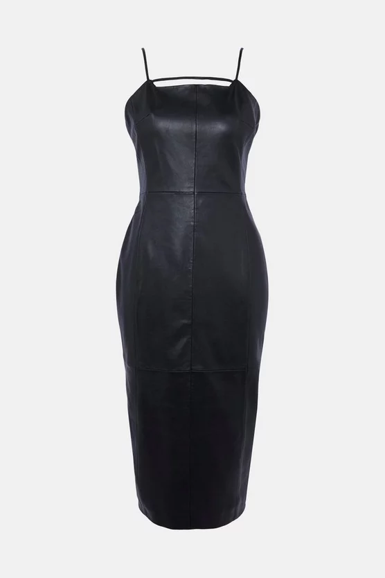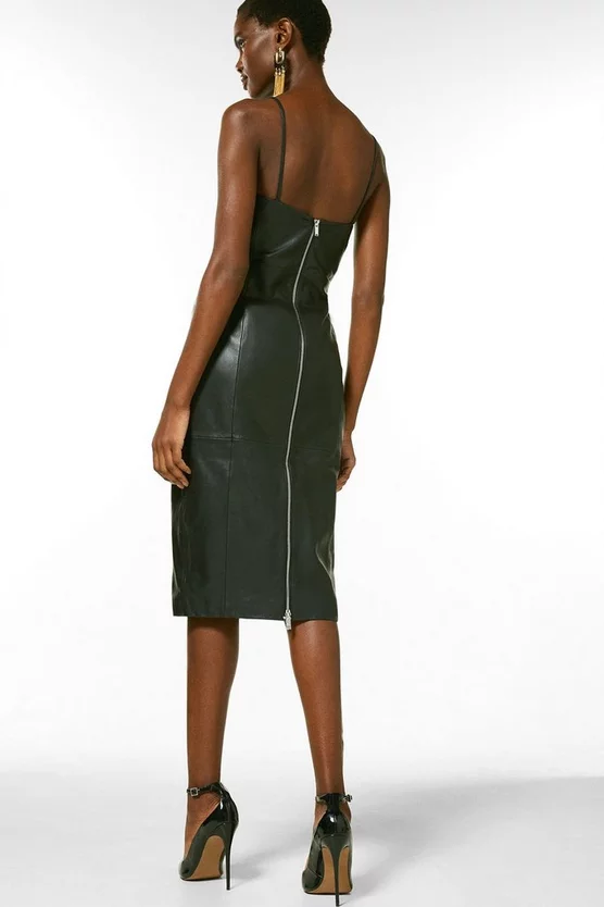 The pencil dress thatβll catch everyoneβs eye. Crafted in our signature buttery soft leather,, this piece is as memorable as it gets. Featuring delicate shoulder straps and expert panelling that’ll contour your figure to perfection, itβll be the talk of the night β and your wardrobe. A glossy Karen Millen-branded back zipper is a luxurious final touch.