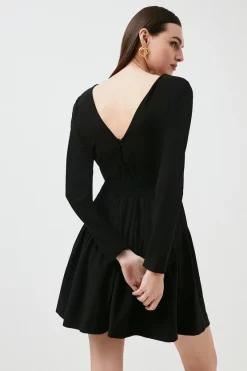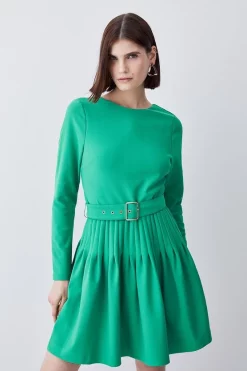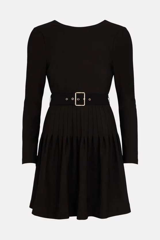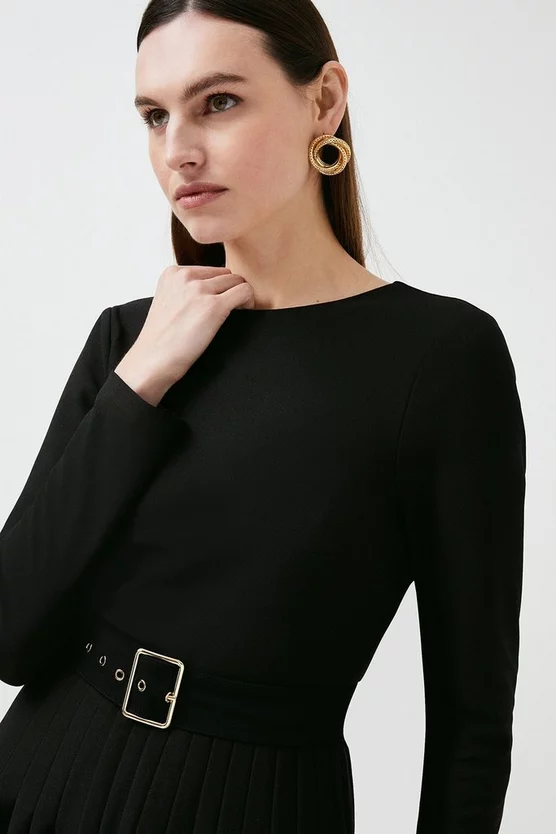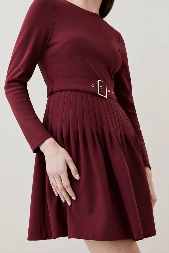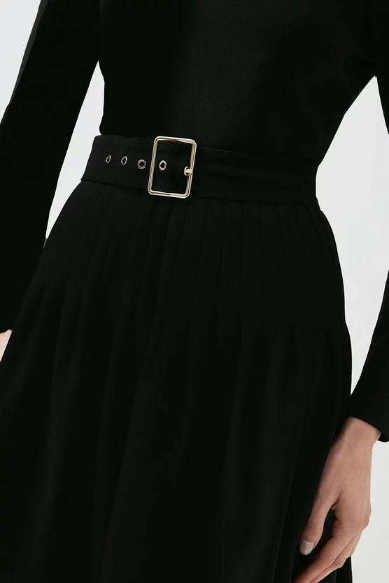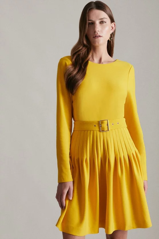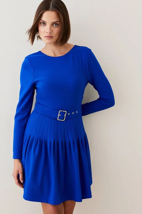 Meet the perfect fit-and-flare dress.. Flaring out into neat pleats from the buckled belt, this quietly luxurious piece solves endless smart-casual styling dilemmas.