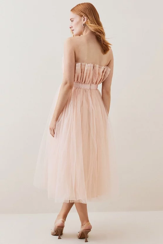 Embodying feminine elegance in every sense, this strapless tulle midi dress makes a truly unique addition to your occasionwear wardrobe. Voluminous tulle fabric flares outwards to create the bodice, while a satin ribbon belt defines the waistline to create an hourglass silhouette. Sheer fabric flows down to a midi hemline, adding the finishing touches to this exquisite design.