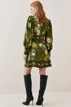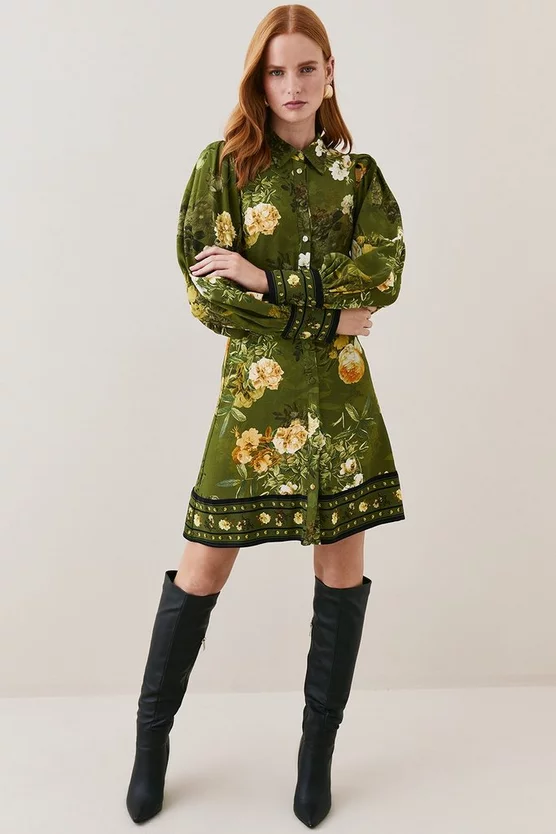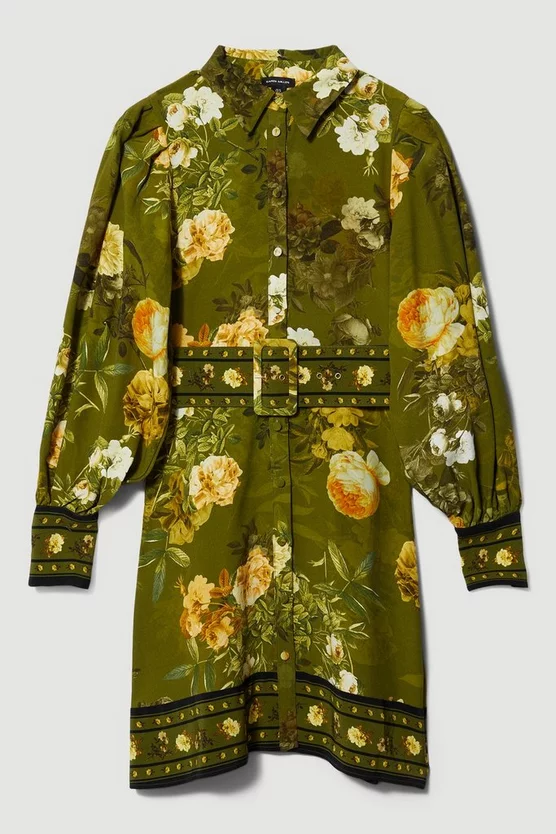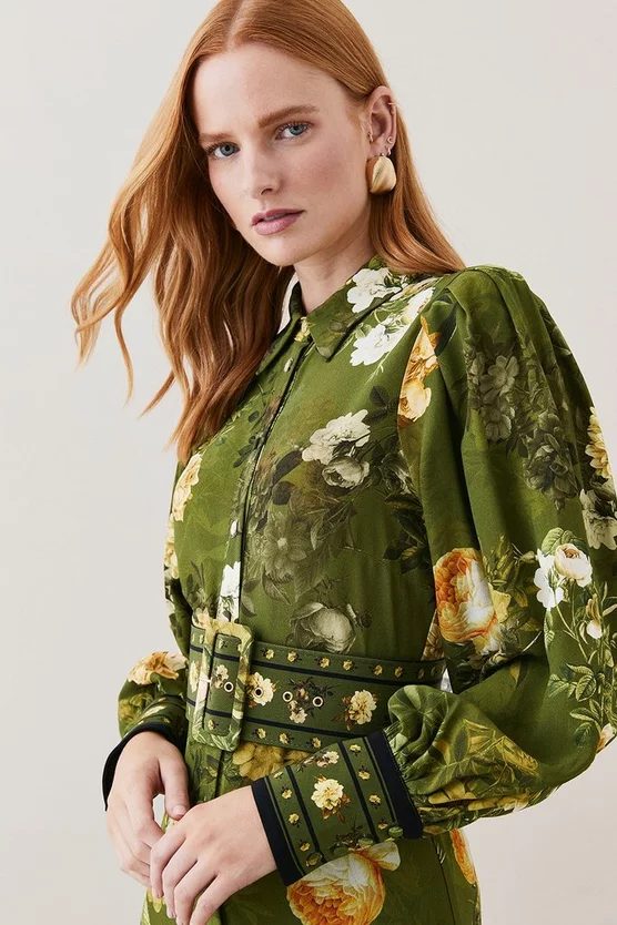 The epitome of botanical beauty, this exquisite shirt dress is enriched with an intricate floral print and vibrant hues. A buckle belt cinches the waist to create a flattering silhouette, while balloon sleeves emphasise the bohemian glamour of this piece.