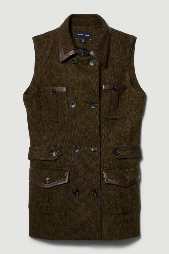 This heritage tweed piece lends timeless appeal to your everyday rotation. This sophisticated sleeveless jacket is crafted from a tweed composition and features signature Karen Millen embossed buttons and classic flap pockets with leather-lined details for a premium finish. Layer over a long-sleeved turtle neck jumper and leather trousers for an elevated everyday look.