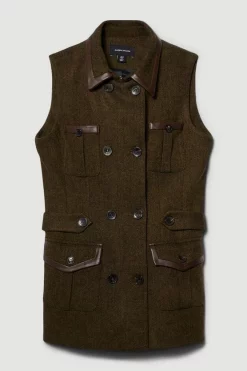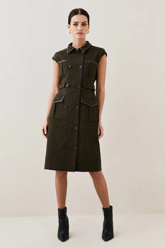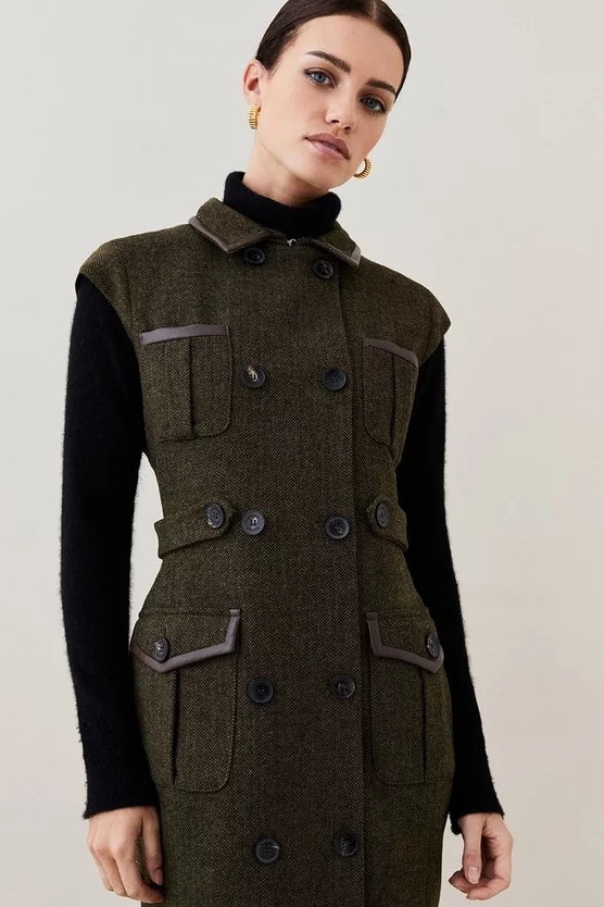 Main: 69% Virgin Wool, 30% Polyester, 1% Elastane. Excluding trims: Lining: 100% Polyester. Dry clean only. Do not wash. Do not tumble dry. Dry iron cool. Model wears UK 8/US 4