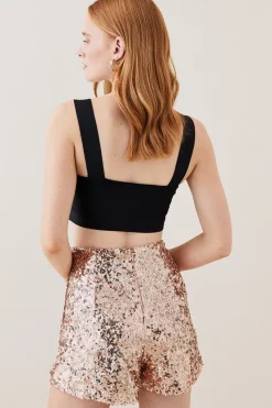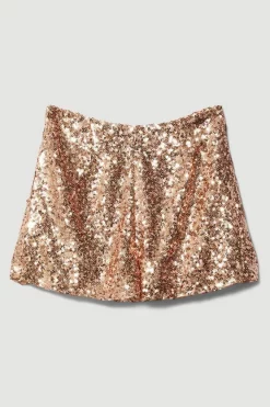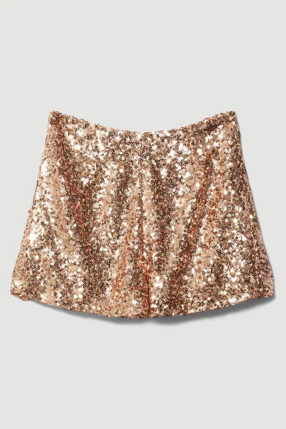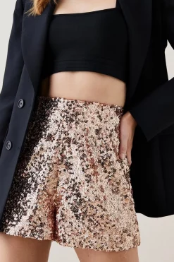 Adorned with lustrous rose gold sequins, these shorts are a party-perfect piece. Style these shorts with a turtle neck jumper to balance out your look, or go all out with a scintillating crop top.