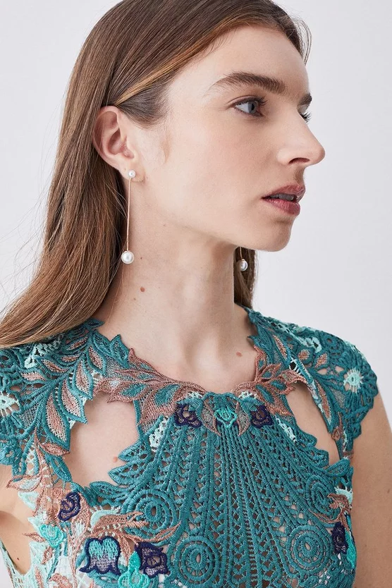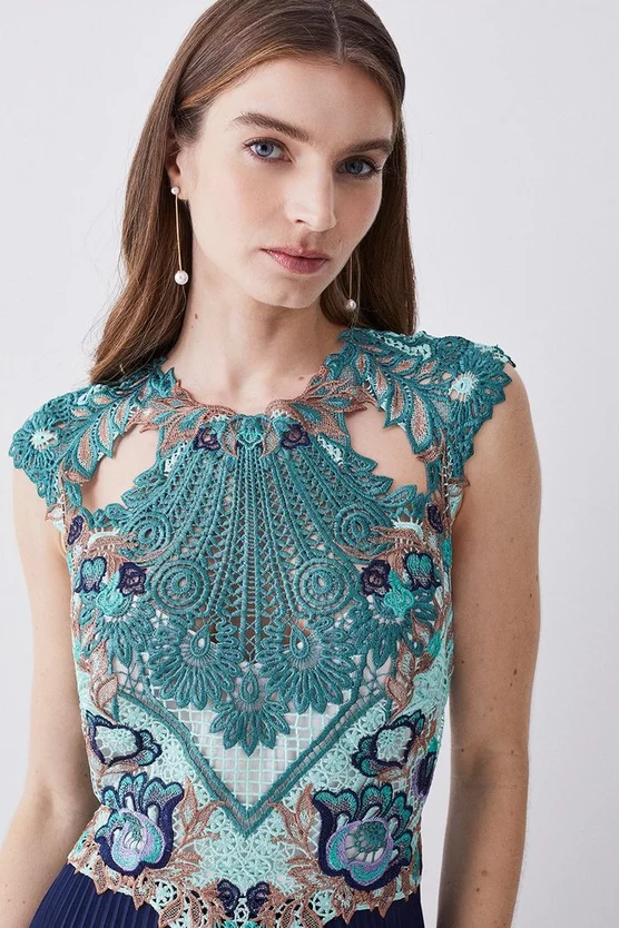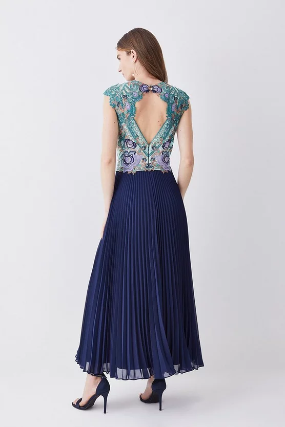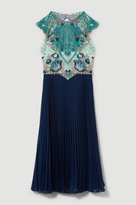Crafted with opulent guipure lace, this pleated midi dress is the epitome of elegance. The bodice is adorned with applique floral details, adding an undeniably feminine touch. Soft pleats fall down to the ankles, showcasing a mesmerising floral print and captivating ocean blue hues.