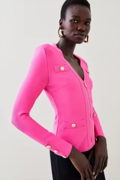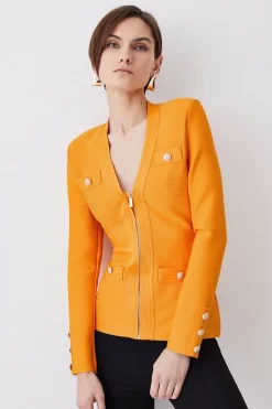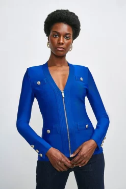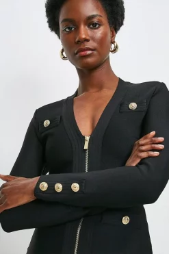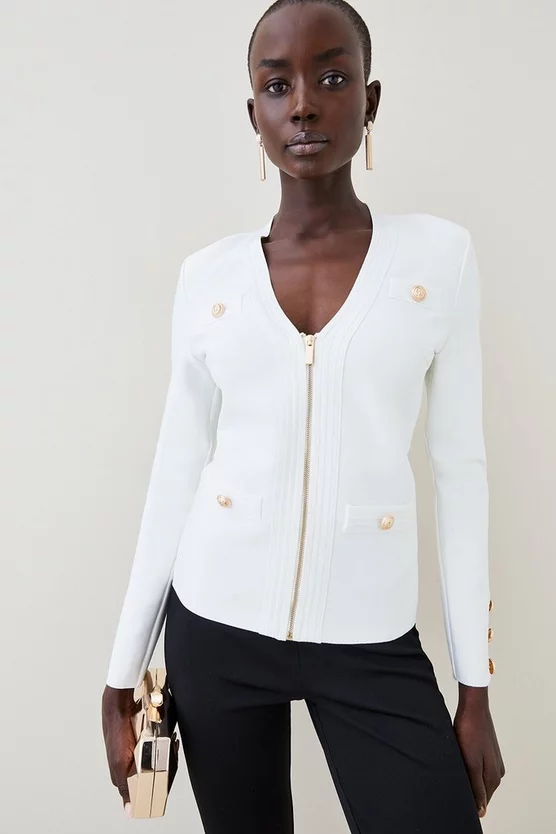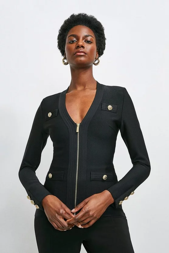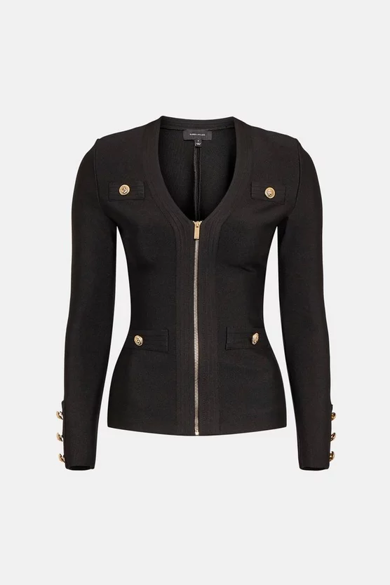 Crafted in a form-fitting bandage knit, this jacket is super versatile and super flattering. Whether worn zipped up or left open, your figure remains beautifully defined. Elevated by luxurious military buttons and textured trims, itll add polish to anything you pair it with.