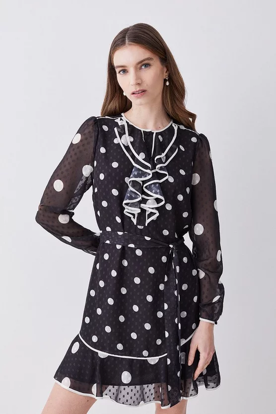 Featuring a classic polka dot print and georgette-style ruffle detailing, this monochrome mini dress can be styled for multiples occasions and seasons.