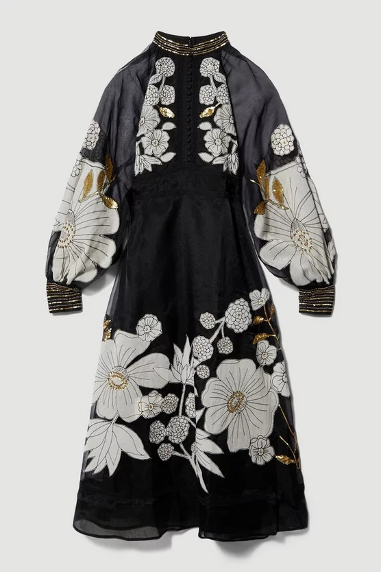 Demonstrate a penchant for fine details in this elegant applique organdie dress. Adorned with floral applique motifs, this opulent organdie design is perfectly suited to grand occasions. Balloon sleeves add dimension to the dress, while intricate gold sequins amp up the glamour.