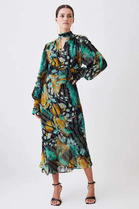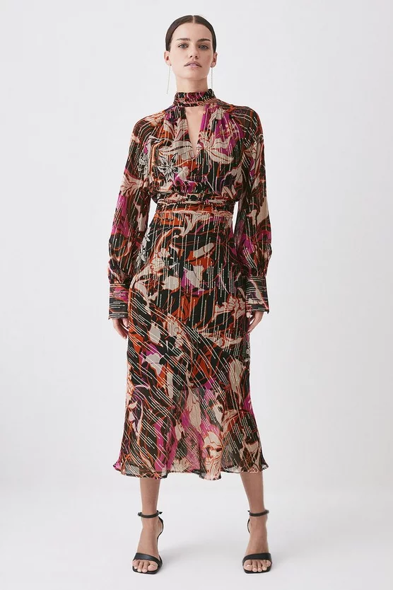 94% Viscose, 6% Metallised Fibre. Lining 100% Polyester. Gentle machine wash at 30 with similar colours. Model Height 5”10 – Model wears a UK 8/US Size 6. Centre back length 130cm.