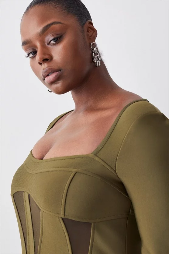 Fusing bandage detailing with mesh cut-outs, this contemporary piece smoothing sculpts the form. A square neckline adds a sultry touch which complements the front mesh details. Style this dress with stiletto heels for an after-dark look.