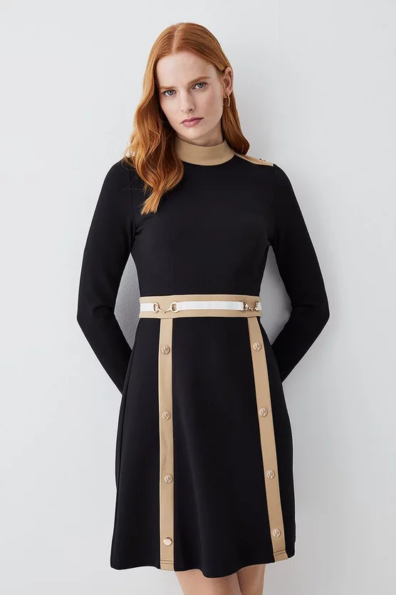 At once both preppy and polished, this neat colour-block dress shows off heritage--style snaffle trims and two rows of glossy gold-tone buttons. Its flattering high-necked fit and flared skirt show off every figure perfectly.