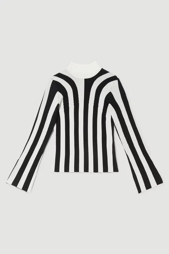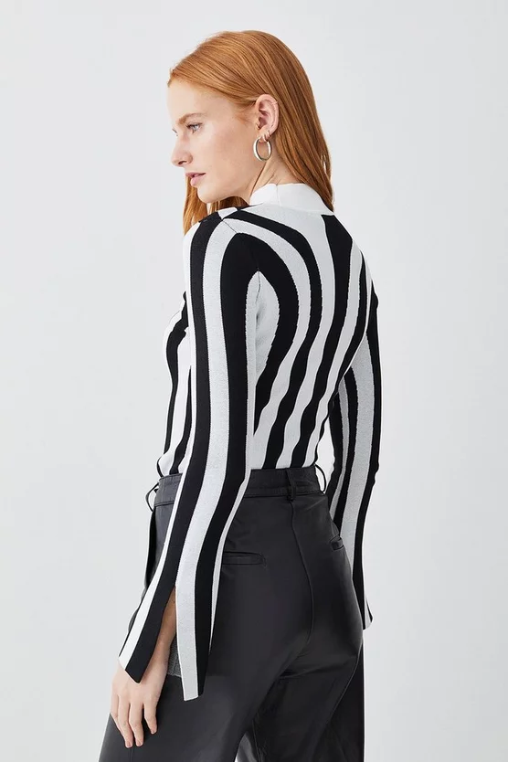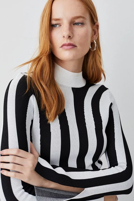 Characterised by a bold monochrome stripe print, this top will fit seamlessly into your capsule wardrobe. Crafted from knitted jacquard material, this long-sleeved top comfortably hugs the form, while fluted cuffs add a feminine touch.