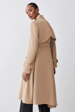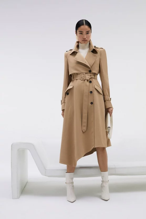 A tailored piece that will pair harmoniously with everything in your collection, this trench coat offers a modern perspective on outerwear. This piece is enhanced with an asymmetric hemline which creates an elegant draped effect, while a cross-over back storm flap creates extra volume. Woven with signature bonded crepe fabric to give structure, this trench coat has a truly premium feel.
