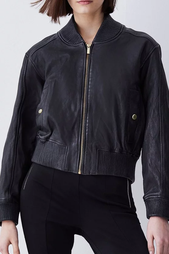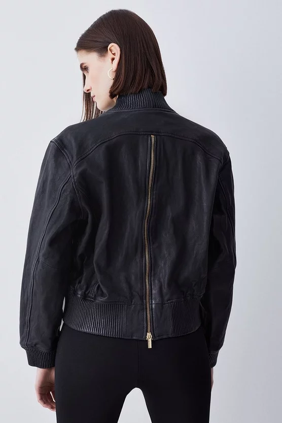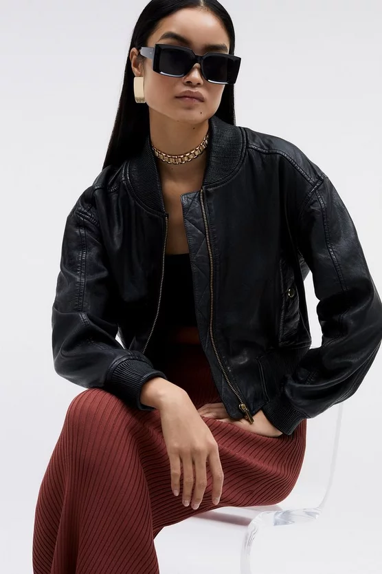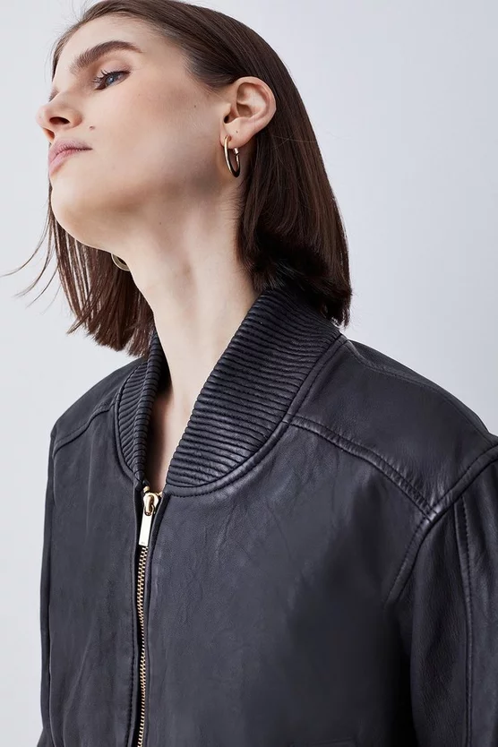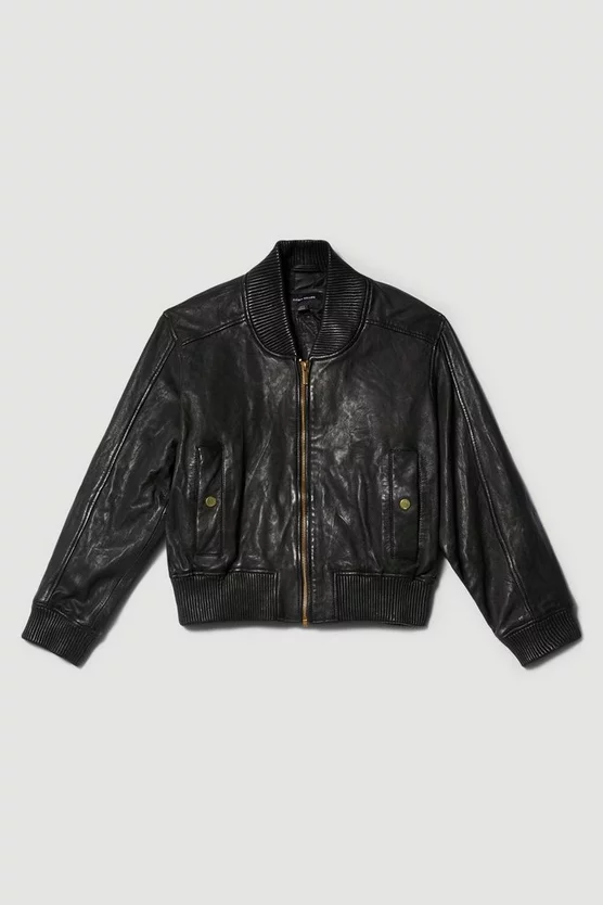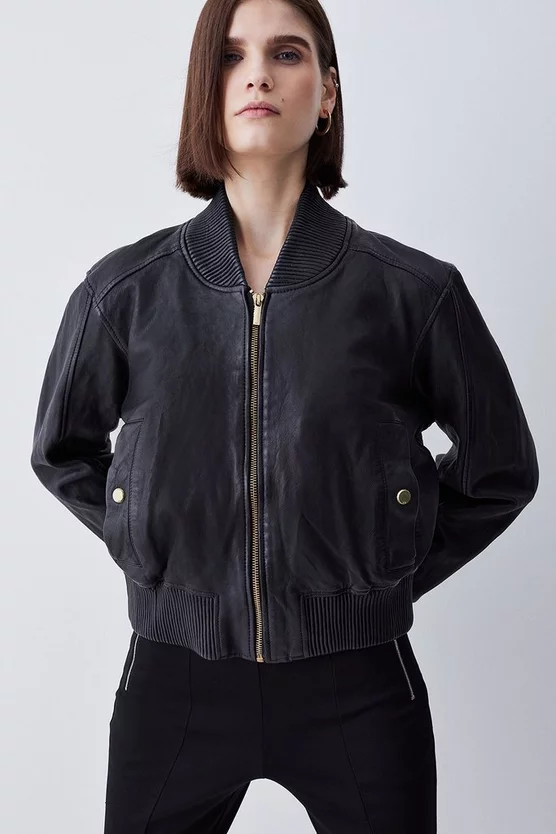 Invest in a timeless classic and embrace an effortlessly cool aesthetic with this leather bomber jacket. Showcasing a washed effect, this jacket adds a considered edge to any ensemble. Side pockets and a front zip closure provide functionality, while a back zip detail allows customisation and adds a contemporary touch.